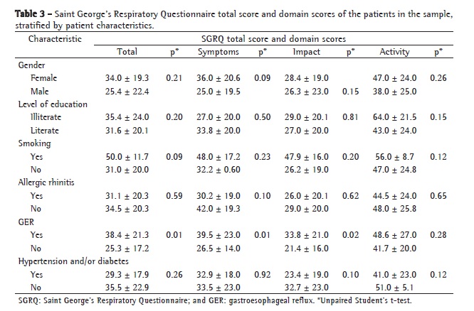 Sociodemographic data (age, gender, and level of education), as well as data regarding duration of disease and presence of comorbidities (diabetes, systemic arterial hypertension, allergic rhinitis, and gastroesophageal reflux [GER]), were collected through a questionnaire. Patients were assessed for rhinitis and GER on the basis of clinical criteria. Cases of allergic rhinitis were defined as those in which patients had recurrent episodes of wheezing, rhinorrhea, pruritus, and nasal congestion that were triggered by respiratory irritants, and cases of GER were defined as those in which patients had had more than two episodes of heartburn per week for more than four weeks.