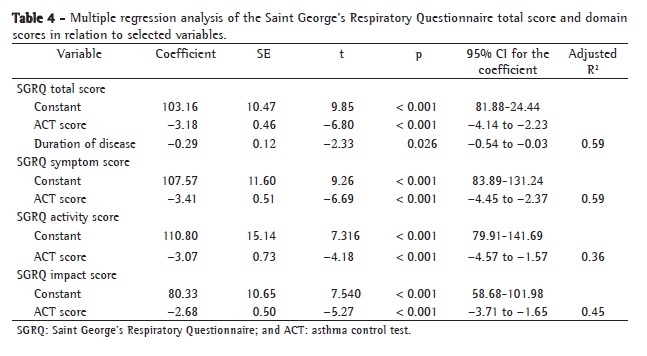 Multiple regression analysis was performed to identify the best independent variables for predicting the impact estimated by the SGRQ (dependent variable). The construction of the model took confounding variables and collinearity into account. The variables that explained the linear variation of the SGRQ total score and domain scores were identified through a backward stepwise process (Table 4). The variables identified as the best predictive variables for good quality of life (analyzing the SGRQ total score) were ACT score (coefficient = −3.18; 95% CI: −4.14 to −2.23) and duration of disease (coefficient = −0.29; 95% CI: −0.54 to −0.03).