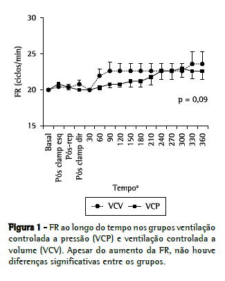 Dentre os 20 animais receptores, 5 foram excluídos por não terem sobrevivido ao transplante. Outros 5 animais morreram antes de completar 360 min de observação (3 do grupo VCV e 2 do grupo VCP), devido a sangramento excessivo e instabilidade hemodinâmica. Dentre os 10 animais sobreviventes, não houve diferenças significativas entre os grupos em relação ao peso corporal, tempo de isquemia total, tempo de anastomose, relação peso úmido/peso seco, consumo total de anestésicos, volume de soluções hidroeletrolíticas administradas e diurese. As medidas da PAM, PAP, FC e temperatura esofágica não revelaram diferenças estatisticamente significativas entre os grupos. A ventilometria obtida em ambos os grupos não revelou diferenças significativas nos valores de VT (p = 0,49). Observou-se uma tendência para valores superiores de FR no grupo VCV (p = 0,09; Figura 1). A FR aumentou ao longo do tempo, sendo significativamente maior nos momentos finais do experimento (p = 0,01). As medidas de PPI, PPLAT (Figura 2), Pmédia, Cdyn e Cstat não diferiram entre os grupos. A relação PaO2/FiO2, PvO2, PaCO2 e PvCO2 foram similares em ambos os grupos, apesar do aumento progressivo e persistente da PaCO2 (Figura 3).
