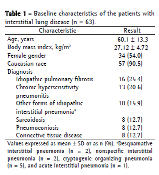 This was a cross-sectional study involving 63 patients with ILD, diagnosed according to clinical, radiological, and histopathological criteria.(1,10) The patients were sequentially selected from among those under treatment at an outpatient clinic of the Porto Alegre Hospital de Clínicas between January of 2007 and August of 2008. The study was approved by the institutional research ethics committee, and all patients gave written informed consent.