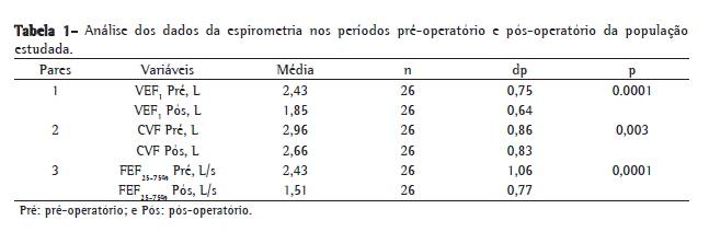 Dos 33 pacientes do estudo, recuperamos somente os dados da espirometria pré-operatória de 26. Os dados espirométricos foram comparados no pré-operatório e no pós-operatório. Observamos que todos os pacientes apresentaram piora da função pulmonar (Tabela 1).