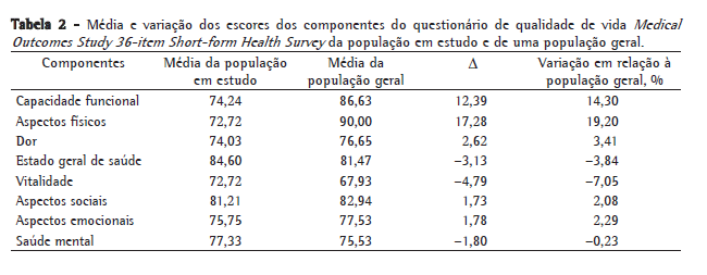 Quando analisamos os resultados do questionário SF-36 na população estudada, em relação aos de uma população geral, não verificamos diferenças estatísticas. A análise da QV geral dos pacientes com câncer submetidos à ressecção pulmonar apresentou valores próximos à de uma população controle, com redução de cerca de 20% nos aspectos físicos e de 5% na média geral (Tabela 2).