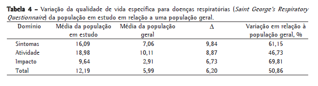 Para a análise estatística do questionário SF-36, utilizamos para a comparação uma população de pacientes normais residentes na cidade de São Paulo.(17) Para o SGRQ, não encontramos valores brasileiros de referência e, portanto, utilizamos os valores de um estudo espanhol comparando uma população geral normal e uma com DPOC.(18)