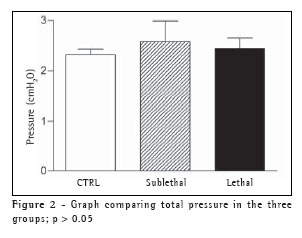 It is known that intervention can provide an inflammatory stimulus of such magnitude that the microbicidal activity of the inflammatory cells that migrated to the focus of the lesion is suppressed by the increased production of nitric oxide.(27-29) This increased nitric oxide production is beneficial at first. However, after the activation of inducible nitric oxide synthase has increased it to the point of overproduction, it begins to inhibit the microbicidal activity of the inflammatory cells, especially that of neutrophils.(27-29) Therefore, we are led to understand that there is not sufficient time for lesion of the pulmonary structure and the consequent attempt at repair to occur, since the chemical change is so great that death precedes any possible structural lesion.