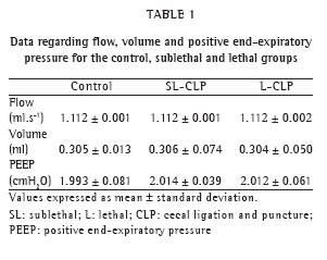 We found no differences between the groups in any of the variables studied. In the literature, we found some studies that drew a correlation between the CLP-induced sepsis model and pulmonary edema.(10-11,22-23) In that correlation, there is evidence in terms of the null hypothesis as well as of the alternative hypothesis. Therefore, our results regarding the null hypothesis are in agreement with those reported in some studies in the literature(10,22-23) if we consider pulmonary edema to imply subsequent alteration in respiratory mechanics.(24-25)