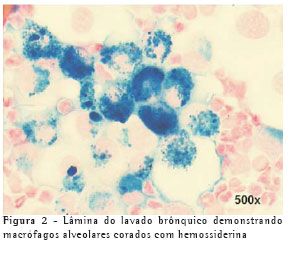 O lavado broncoalveolar (LBA) realizado demonstrou perfil inflamatório predominantemente neutrofílico (55% de neutrófilos, 10% de linfócitos, 31% de macrófagos e 4% de eosinófilos). As culturas foram negativas para todos os patógenos pesquisados (bactérias, micobactérias e fungos). O LBA revelou macrófagos corados com hemossiderina em mais de 20% da amostra (Figura 2). O LBA foi realizado segundo as técnicas padronizadas pela European Respiratory Society.(9)