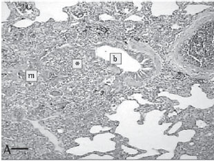 Observaram-se áreas micro-hemorrágicas em ambos os pulmões. O tecido peribrônquico alveolar mostrou sinais de colapso e acúmulo intra-alveolar de macrófagos alveolares corados com hemossiderina. Os bronquíolos apresentaram aspecto constritivo com espessamento da mucosa e discreta inflamação com extensão ao parênquima pulmonar.