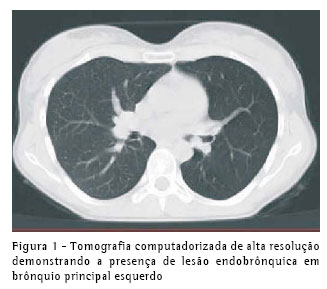 A tomografia computadorizada de alta resolução subseqüente demonstrou a presença de um nódulo circunscrito e pedunculado projetado na luz do brônquio principal esquerdo, sem comprometimento de estruturas mediastinais adjacentes (Figura 1).