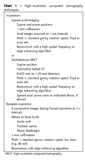 There are multiple protocols in current use for obtaining HRCT scans. Examples of two such protocols-spaced axial images and multidetector volumetric HRCT-are given in Chart 1. Axial imaging has the advantage of having slightly better resolution and is a low radiation-dose technique. Volumetric imaging allows assessment of the entire lung.