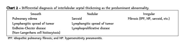 Interlobular septal thickening (Figure 1) is defined as thickening of the interstitium that surrounds and delineates the secondary pulmonary lobule. Septal lines tend to be straight and 1-2 cm in length. The centrilobular artery, which lies in the center of the pulmonary lobule, is often visible. A few interlobular septa are often seen in normal patients. In abnormal patients, however, many will be seen, outlining the polygonal lobules. It is important to note that septal thickening can be seen in a wide variety of diseases. This finding is most useful when it is the predominant abnormality, in which case the differential diagnosis is limited and depends upon whether the thickening is smooth, nodular, or irregular (Chart 2). The clinical context, especially information regarding the duration of clinical symptoms and the tempo of disease progression, is extremely helpful in the interpretation of interlobular septal thickening.