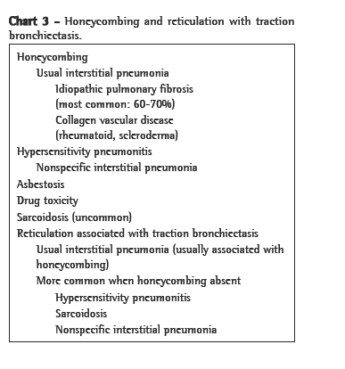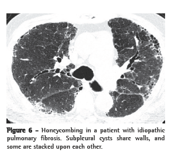 Honeycomb lung remodeling (honeycombing) reflects the end stage of a number of diseases that cause parenchymal destruction. It presents a characteristic HRCT pattern, with subpleural, thick-walled cysts that share walls and, when advanced, are often stacked in multiple layers (Figure 6). It is typically accompanied by other signs of fibrosis (traction bronchiectasis and reticulation). Honeycombing is highly suggestive of a pathologic diagnosis of usual interstitial pneumonia (UIP), although it can be attributable to other diseases (Chart 3). Honeycombing seen on HRCT scans is often considered diagnostic of UIP in patients presenting the appropriate clinical profile, and the majority of such patients will not be subjected to surgical lung biopsy. Because bilateral honeycombing on HRCT scans is considered diagnostic under these conditions, it is vitally important for the radiologist to be confident that honeycombing is truly present before describing it.
