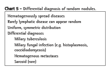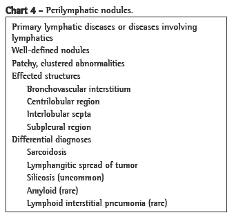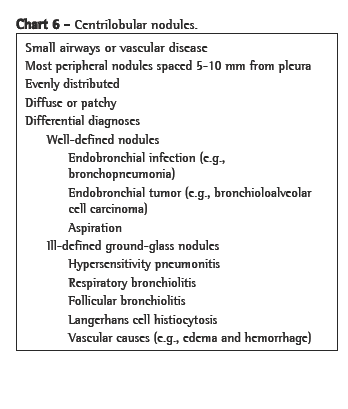 There are several ways to classify nodules: well-defined vs. poorly-defined; upper vs. lower lobe distribution; and relationship to the secondary pulmonary lobule. The last is the most useful characteristic, since it provides a focused differential diagnosis and is reflective of the underlying disease pathophysiology. There are three possible HRCT distributions of nodules: perilymphatic, random, and centrilobular (Charts 4, 5, and 6).