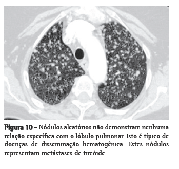 peribronchovascular regions, interlobular septa, and pleura, without a consistent perilymphatic pattern and absence of a consistent relationship with the secondary pulmonary lobule. An HRCT image from a patient with hematogenous metastases from thyroid cancer is shown in Figure 10.
