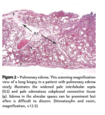 Although HRCT is not usually required for the diagnosis of pulmonary edema, it can be performed when there is a discrepancy between the clinical history and findings seen on the chest X-ray. In the absence of an enlarged heart silhouette, echocardiography can reveal diastolic dysfunction, such as mitral reflux, left atrial enlargement, and elevated pulmonary artery pressure. Brain natriuretic peptide levels can also be elevated.(2) To rule out myocardial infarction, which can be asymptomatic, cardiac enzyme levels should be determined and an electrocardiogram should be performed. Elevated creatinine levels can indicate underlying renal failure, another cause of pulmonary edema. An example of pulmonary edema in a lung biopsy is presented in Figure 2.