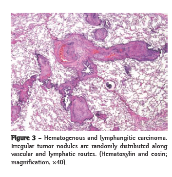 Hematogenous metastasis is the most common cause of multiple randomly distributed pulmonary nodules. Basilar predominance is typical, due to preferential blood flow to the lung bases. Since the malignant cells enter the pulmonary lymphatics, features of lymphangitic carcinomatosis with irregularly thickened interlobular septa and pleural effusion are common. In surgical lung biopsies, irregular nodules of endovascular and endolymphatic tumor are present (Figure 3).