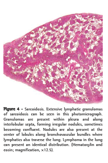 Lymphoid pulmonary lesions constitute a general category of disease that includes follicular ­bronchiolitis, nodular lymphoid hyperplasia, lymphoid interstitial pneumonia, and low grade lymphoma.(9) In rare cases, lymphoid hyperplasia can simulate sarcoidosis, since the involvement is concentrated along the septa, in subpleural areas, and around airways (all of the locations of lymphatic channels in the lung).