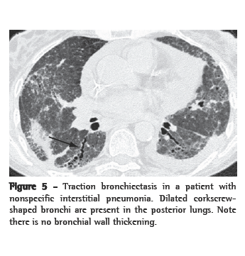 Bronchial dilatation occurring as a consequence of interstitial fibrosis is referred to as traction bronchiectasis (Figure 5). The bronchi often appear irregular (corkscrewed) and are not associated with radiologic evidence of bronchial inflammation (gross bronchial wall thickening or mucous impaction). Traction bronchiectasis is often accompanied by other signs of lung fibrosis (honeycombing or irregular reticulation). While traction bronchiectasis is quite specific for fibrosis, the differential diagnosis is broader than that of honeycombing. Idiopathic pulmonary fibrosis (IPF) is commonly associated with traction bronchiectasis. However, in the absence of honeycombing, other diseases are more likely (Chart 3). In patients with known collagen vascular disease, bibasilar, peripheral, traction bronchiectasis accompanied by ground-glass attenuation can be considered diagnostic of NSIP. When the circumstances are less diagnostic, a surgical biopsy might be required.