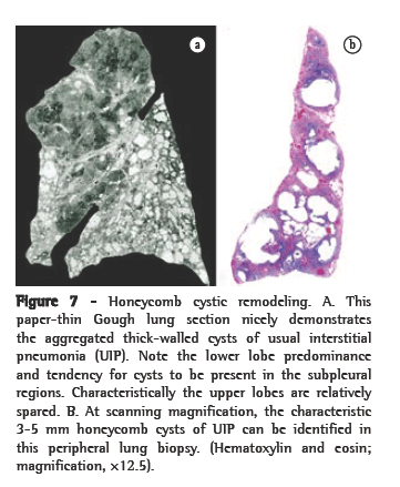 A surgical lung biopsy finding of UIP is characteristic of IPF, which is a chronic idiopathic form of lung fibrosis. The histopathology of UIP is one of destructive fibrosis alternating with normal lung in the surgical biopsy specimen (Figures 7 and 8). A characteristic advancing edge of focal injury is always present and is referred to as "fibroblastic foci". Clinical diagnostic criteria for UIP were proposed by a consensus committee of the American Thoracic Society/European Respiratory Society in 2000.(10)