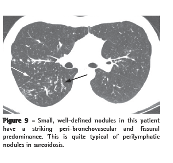 Perilymphatic nodules are characterized by their distribution in the bronchovascular sheath, pleura, and interlobular septa, corresponding to the lymphatic routes in the lung (Figure 9). All of the conditions in this category necessarily have an affinity for the lymphatic channels.