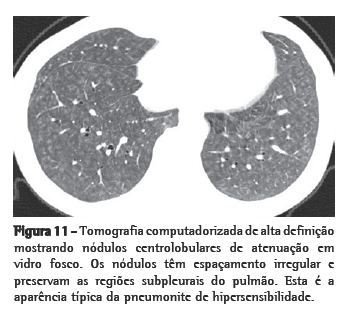Reações de hipersensibilidade a antígenos orgânicos inalatórios abrangem um grupo de doenças pulmonares difusas mediadas por reações imunes e provocadas pela inalação repetitiva de uma ampla variedade de poeiras orgânicas, bioaerossóis e compostos químicos. Estas doenças são coletivamente classificadas como pneumonite de hipersensibilidade (PH). A exposição continuada a tais antígenos tipicamente ocorre nos domicílios. No Brasil, ela é especialmente associada a aves domésticas e a grandes concentrações de bolores dentro dos ambientes.(15) Na PH crônica, achados em TCAR indicativos de fibrose estão presentes e relacionam-se com pior prognóstico. O faveolamento é comum nas formas crônicas. Em um estudo realizado no Brasil, o faveolamento estava presente em 48 (57%) dos 85 pacientes submetidos à biópsia pulmonar cirúrgica.(16) A doença estava restrita aos lobos superiores em apenas 11 casos. Entretanto, quando havia envolvimento dos lobos inferiores, outros achados indicativos de PH, tais como nódulos centrolobulares, áreas de atenuação diminuídas, áreas de atenuação em vidro fosco e distribuição peribrônquica das lesões, estavam comumente presentes. Em amostras de biópsia, isto é traduzido como infiltração intersticial inflamatória crônica, concentrada ao redor das vias aéreas e freqüentemente acompanhada por bronquiolite crônica e pequenos granulomas intersticiais não-necrotizantes. Em somente 6% dos casos, a TC revelou distribuição periférica de faveolamento, mimetizando PIU. Nenhum dos pacientes apresentou lesões similares a PIU nas biópsias pulmonares. Estes achados são semelhantes aos de outros estudos.(17,18) Em pacientes com doença pulmonar fibrosante e expostos a antígenos provocadores de PH, um diagnóstico clínico pode ser aceito desde que o contexto da TC seja apropriado e a citologia do LBA revele linfocitose.(19)