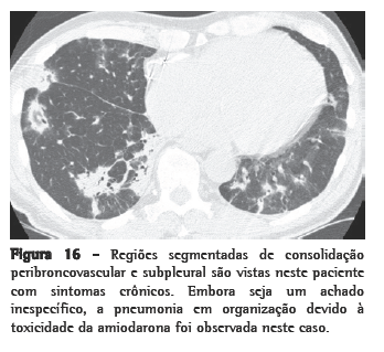 Doenças devido à toxicidade de drogas podem resultar em DIPD, com reações histopatológicas que variam desde lesões agudas a padrões fibróticos similares aos de PIU.(36) Os mecanismos de lesão pulmonar induzida por drogas variam entre citotoxicidade e reações de hipersensibilidade. Uma grande variedade de reações relacionadas à terapêutica têm sido descritas como conseqüência do uso de agentes quimioterapêuticos (bleomicina, bussulfan, clorambucil, ciclofosfamida, 1,3-bis(2-cloroetil)-1-nitrosouréia e 1-(2-cloroetil)-3-ciclohexil-1-nitrosouréia), estatinas, amiodarona, nitrofurantoína, metotrexato e radioterapia torácica. É geralmente necessária a realização de broncoscopia com biópsia brônquica para descartar infecção. A biópsia pulmonar cirúrgica não é específica para uma droga em particular na grande maioria dos casos.(37)