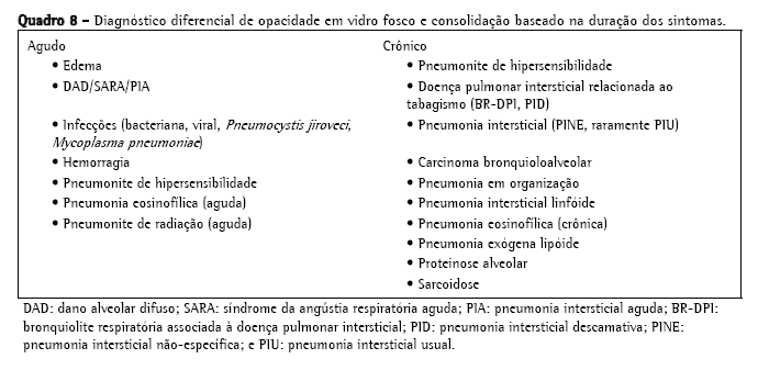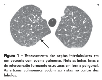 O espessamento dos septos interlobulares (Figura 1) é definido como o espessamento do interstício que envolve e delineia o lóbulo pulmonar secundário. As linhas dos septos tendem a ser retas e com 1-2 cm de comprimento. A artéria centrolobular, localizada no centro do lóbulo pulmonar, é geralmente visível. Alguns septos interlobulares são normalmente visualizados em pacientes normais. Em pacientes com anormalidades, entretanto, muitos podem ser visualizados, delineando os lóbulos poligonais. É importante enfatizar que o espessamento dos septos ocorre em uma grande variedade de doenças. Este achado é mais útil quando é a principal anormalidade, quando o diagnóstico diferencial é limitado e dependente do tipo de espessamento: liso, nodular ou irregular (Quadro 2). O contexto clínico, em especial as informações a respeito da duração dos sintomas clínicos e o tempo de progresso da doença, é extremamente útil na interpretação do espessamento dos septos interlobulares.
