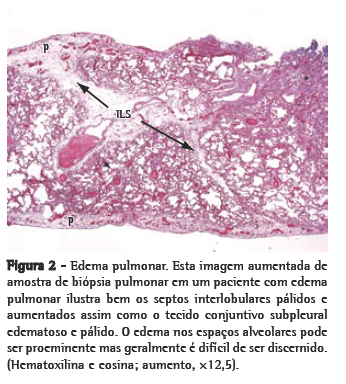 Embora a TCAR não seja geralmente necessária para o diagnóstico de edema pulmonar, ela pode ser realizada quando houver uma discrepância entre a história clínica e os achados em radiografia de tórax. Na ausência de uma silhueta cardíaca aumentada, a ecocardiografia pode revelar disfunções diastólicas, tais como refluxo mitral, aumento do átrio esquerdo e pressão elevada da artéria pulmonar. Os níveis de peptídeo natriurético cerebral também podem estar aumentados.(2) Para descartar infarto do miocárdio, que pode ser assintomático, os níveis de enzimas cardíacas devem ser determinados, e um eletrocardiograma deve ser realizado. Níveis elevados de creatinina podem indicar insuficiência renal como doença de base, uma outra causa de edema pulmonar. A Figura 2 mostra um exemplo de edema pulmonar a partir de biópsia de pulmão.