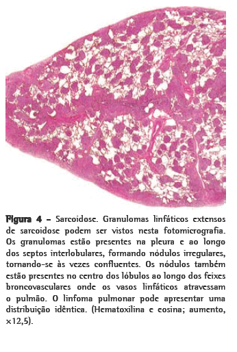 granulomatousA sarcoidose é uma doença granulomatosa não infecciosa com provável origem imune. A distribuição de granulomas nodulares ao longo das vias linfáticas é praticamente diagnóstica de sarcoidose em TCAR. A biópsia pulmonar a partir da broncoscopia pode ser necessária para o diagnóstico de casos sem lesões em sítios mais acessíveis, tais como pele (exceto eritema nodoso, no qual a biópsia mostra achados inespecíficos) ou linfonodos superficiais. Um alto grau de acurácia diagnóstica é atingido se mais do que quatro amostras forem obtidas na broncoscopia. Isto é possível pois os canais linfáticos atravessam os feixes broncovasculares em grande número e, portanto, são amplamente obtidos na amostra a partir de biópsia transbrônquica.(41) Além disso, para o diagnóstico de sarcoidose, a sensibilidade e a especificidade de uma razão de CD4/CD8 > 3.5 no líquido da LBA são 52-59% e 94-96%, respectivamente.(42) A Figura 4 mostra a biópsia pulmonar cirúrgica de um paciente com sarcoidose. A distribuição linfática pode ser marcante e recapitula os achados na TCAR.