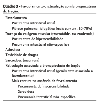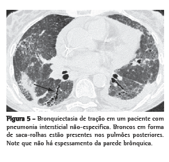 A dilatação dos brônquios como conseqüência da fibrose intersticial é referida como bronquiectasia de tração (Figura 5). Os brônquios têm geralmente aparência irregular (saca-rolhas) e não estão associados com evidências radiológicas de inflamação brônquica (espessamento grosseiro da parede brônquica ou impactação mucóide). A bronquiectasia de tração é geralmente acompanhada por outros sinais de fibrose pulmonar (faveolamento ou reticulação irregular). Apesar da bronquiectasia de tração ser bastante específica para a fibrose, o diagnóstico diferencial é mais amplo do que aquele para faveolamento. A fibrose pulmonar idiopática (FPI) é comumente associada à bronquiectasia de tração. Entretanto, na ausência de faveolamento, outras doenças são mais prováveis (Quadro 3). Em pacientes com histórico de doença do colágeno vascular, a bronquiectasia de tração bibasal e periférica, acompanhada de atenuação em vidro fosco, pode ser considerada como diagnóstico de PINE. Quando as circunstâncias são menos diagnósticas, pode ser necessária uma biópsia cirúrgica.