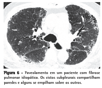 O remodelamento do pulmão em favo de mel (faveolamento) reflete o estágio terminal de um número de doenças que causam destruição do parênquima. Apresenta um padrão característico na TCAR, com cistos subpleurais com paredes espessas que compartilham paredes e, quando avançado, geralmente formam empilhamentos em camadas múltiplas (Figura 6). É tipicamente acompanhado por outros sinais de fibrose (bronquiectasia de tração e reticulação). O faveolamento fortemente sugere um diagnóstico patológico de pneumonia intersticial usual (PIU), embora ele possa ser atribuído a outras doenças (Quadro 3). O faveolamento observado na TCAR é geralmente considerado como diagnóstico de PIU em pacientes apresentando perfil clínico apropriado, e a maioria desses pacientes não necessita de biópsia pulmonar cirúrgica. Como o faveolamento bilateral em TCAR é considerado diagnóstico sob estas condições, é de vital importância que o radiologista tenha a certeza de que o faveolamento está presente antes de descrevê-lo.