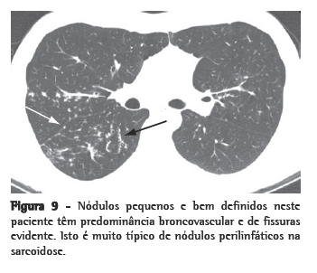 As lesões pulmonares linfóides constituem uma categoria geral de doenças que inclui bronquiolite folicular, hiperplasia linfóide nodular, pneumonia intersticial linfóide e linfoma de baixo grau.(9) Em casos raros, a hiperplasia linfóide pode simular a sarcoidose, visto que o envolvimento é concentrado ao longo dos septos, em áreas subpleurais e ao redor das vias aéreas (todas os locais de canais linfáticos no pulmão).