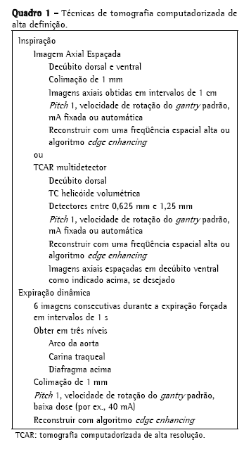 Há vários protocolos de uso corrente para a obtenção de imagens em TCAR. O Quadro 1 mostra exemplos de dois destes protocolos: imagens axiais espaçadas e TCAR multidetector volumétrica. Imagens axiais apresentam a vantagem de ter uma resolução um pouco melhor, e esta técnica tem baixa dosagem de radiação. Imagens volumétricas permitem uma avaliação de todo o pulmão.