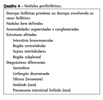 Há várias formas de se classificar nódulos: bem definidos vs. mal definidos; distribuição nos lobos superiores vs. inferiores; e sua relação com lóbulos pulmonares secundários. Esta última é a característica mais útil, visto que fornece um diagnóstico diferencial focado e reflete a fisiopatologia da doença de base. Há três distribuições possíveis dos nódulos em TCAR: perilinfática, aleatória e centrolobular (Quadros 4, 5 e 6).