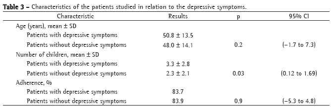 The mean ± SD for the Beck Depression Inventory score was 13.4 ± 10.0 points (median, 11 points), and 54 individuals (33.8%) were classified as having depressive symptoms, scoring more than 20 points on the Beck Depression Inventory. Table 3 presents the principal characteristics of the studied patients in relation to depressive symptoms. There was no significant association between adherence to treatment and depressive symptoms (p = 0.23). The rate of adherence was similar in the two groups of patients (83%; p = 0.9).