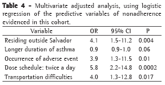 Various factors can be considered predictors of adherence to treatment in patients with asthma. In the present study, we found an association between adherence to treatment and the following variables: adverse events; living far from the health facility; transportation difficulties; and dosage interval of multiple doses. Asthma was less controlled in patients presenting low adherence. In the present study, we were unable to evaluate the relationship between adherence to treatment and the different classifications of the severity of asthma, since all patients selected had severe persistent asthma according to the criteria of the Brazilian Thoracic Association.(12)