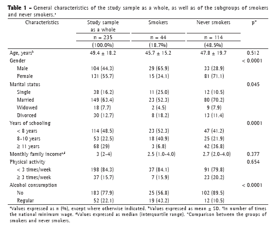 Smokers, former smokers, and never smokers accounted for 18.7%, 32.8%, and 48.5%, respectively, of the study population. The prevalence of passive smoking was high (46.7%). Most of the participants were female (n = 131; 55.7%) and married (n = 149; 63.4%). The mean age was 49.4 ± 18.2 years. Nearly half of the study sample consisted of individuals who were illiterate or had had less than 9 years of schooling. The median family income was 3 times the national minimum wage. Most of the patients did not perform physical activities or consume alcoholic beverages regularly (84.3% and 77.9%, respectively; Table 1).