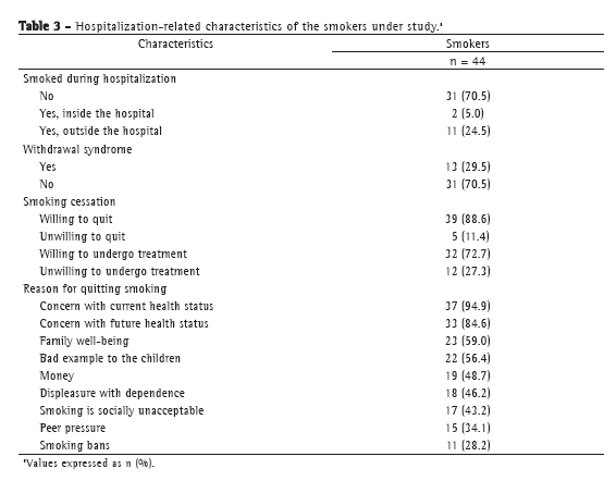 Most (70.5%) of the interviewees reported not having smoked during their hospital stay, and 13 (29.5%) presented with nicotine withdrawal syndrome. Of the smokers, 39 (88.6%) reported that they wanted to quit smoking definitively, and 32 (72.7%) reported that they were willing to undergo smoking cessation treatment during their hospital stay. As can be seen in Table 3, the principal reasons why the patients wanted to quit smoking were a concern with their current health status (in 94.9%), a concern with their future health status (in 84.6%), a desire to improve the well-being of their families (in 59.0%), and the fact that smoking sets a bad example to their children (in 56.4%).