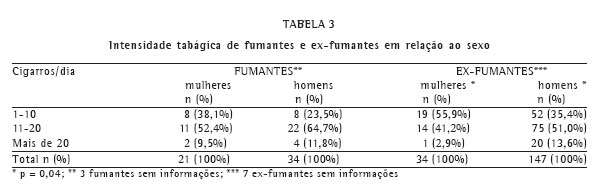 A Tabela 3 mostra a intensidade do tabagismo em relação ao sexo, e revela que a maioria dos homens fumava onze a vinte cigarros por dia, enquanto que a maioria das mulheres encontrava-se no grupo que fumava um a dez cigarros por dia (p = 0,04). Também os homens fumaram mais que as mulheres, quando analisada a intensidade do hábito através de maços-ano. Os homens fumaram 15,81 ± 15,23 contra 10,09 ± 11,95 maços-ano entre as mulheres (p = 0,003).
