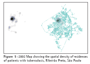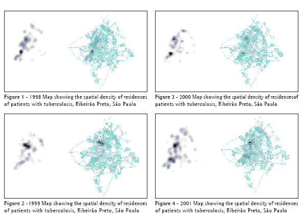 By consulting the maps, we noted that the distribution of the at-risk population in the city of Ribeirão Preto was heterogeneous. In the analysis of the spatial density of residences in which TB cases were reported, it was found that the concentration of cases in 1998 was highest in a portion of the western region of the city, decreasing toward other neighborhoods.