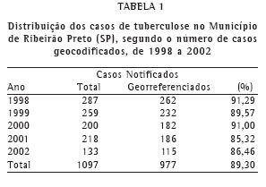 O objetivo deste estudo foi descrever a distribuição espacial da tuberculose (Tb) na área urbana do Município de Ribeirão Preto, no período de 1998 a 2002, utilizando dados secundários.