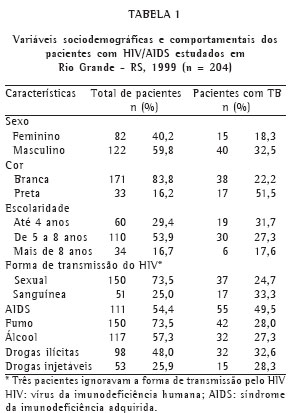 Objetivo: Considerando a relevância da co-infecção vírus da imunodeficiência humana/tuberculose, este estudo foi desenvolvido para determinar a prevalência e os fatores associados à tuberculose em pacientes residentes em uma zona de alta prevalência das duas infecções. Métodos: Todos os pacientes atendidos no ano de 1999 no Serviço HIV/AIDS do Hospital Universitário da Universidade Federal do Rio Grande foram avaliados retrospectivamente desde o momento do diagnóstico da presença do vírus da imunodeficiência humana, em relação à ocorrência de tuberculose e sua associação com fatores sociodemográficos, comportamentais e imunológicos. Resultados: A amostra incluiu 204 pacientes e a prevalência encontrada de tuberculose foi de 27%. A análise multivariada mostrou que existe uma associação significativa do desenvolvimento de tuberculose com a raça negra (razão de chance: 4,76; intervalo de confiança de 95%: 1,93 -11,72) e uma relação inversa com a contagem de linfócitos TCD4+ no momento do diagnóstico do vírus da imunodeficiência humana (razão de chance: 0,995; intervalo de confiança de 95%: 0,993-0,997). O sexo masculino (razão de chance: 2,49; intervalo de confiança de 95%: 1,15-5,39) e o uso de drogas (razão de chance: 2,1; intervalo de confiança: 95% de 1,02-4,31) podem também ser fatores de risco quando analisados separadamente. Conclusão: Os fatores responsáveis pelo desenvolvimento da tuberculose entre os pacientes soropositivos para o vírus da imunodeficiência humana incluem os aspectos imunitários e fatores socioeconômicos e demográficos. A alta taxa de tuberculose em pacientes soropositivos torna urgente implementar estratégias que combinem rápida identificação e tratamento dos casos, comunicantes e indivíduos com infecção latente.