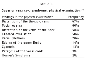 The physiopathology of SVCS was reviewed, demonstrating that the superior vena cava is vulnerable to obstruction caused by the following factors: its strategic location in the visceral compartment of the mediastinum, surrounded by rigid structures (such as the sternum, trachea, right mainstem bronchus, aorta and right pulmonary artery); its thin, easily compressed walls; the transport of blood at low pressures; and the fact that it is completely circumscribed by the mediastinal (subcarinal, perihilar and paratracheal) lymph nodes. These factors can explain many of the clinical and pathological aspects of the syndrome.(6)