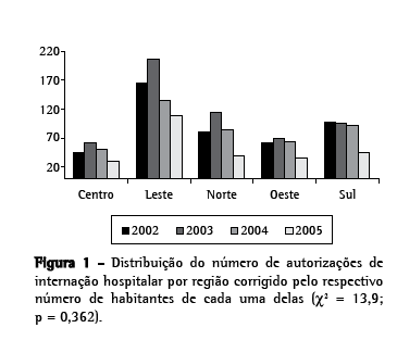 A Figura 1 mostra o número de internações em cada região da cidade, nos quatro anos de estudo, corrigido pelo respectivo número de habitantes de cada uma delas. Constata-se que ocorreu diminuição do número de internações hospitalares por asma em todas as regiões do município no ano de 2005.