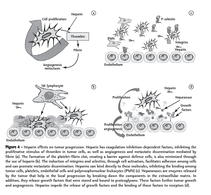 In this context, anticoagulant medications promise to play a role by minimizing the tumor-promoting effects of this relationship, not only by inhibiting direct products, such as thrombin and fibrin, but also by inhibiting tissue penetration, angiogenesis and local stimulation of trophic factors. Until then, the effects and safety profiles of heparins, LMWHs in particular, will apparently continue to improve.