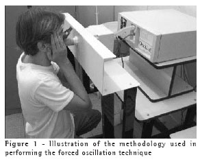 The system adopted for the FOT trials followed the principles previously described.(6) We must highlight the fact that the FOT should not be confused with the impulse oscillometry technique, which differs in the method of excitation, processing and presentation of results.(10-11)
