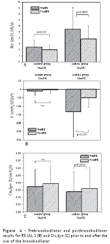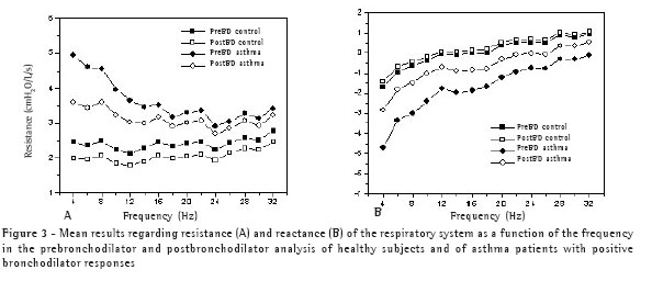 prebronchodilator resistance was higher in asthma patients than in healthy subjects. Another important observation is that the alterations in R0 were greater in asthma patients than in control subjects, confirming the results of pilot studies conducted by our group, in which smaller patient samples were involved.(7-8) Even after the use of the bronchodilator, the R0 of asthma patients remained higher. This is probably related to the inflammatory effect of the disease.