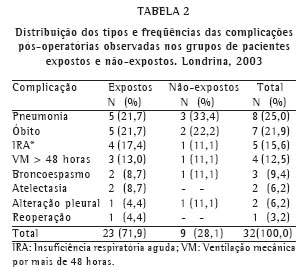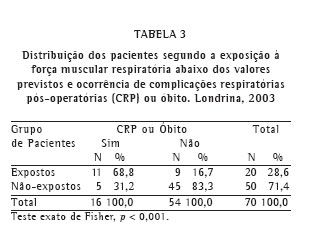 Em 16 dos 70 pacientes, o quadro clínico evoluiu para pelo menos uma CRP ou óbito, totalizando 32 ocorrências, descritas na Tabela 2. A incidência total de CRP na amostra, incluído o óbito, foi, portanto, de 22,86% (16/70). Todos os casos de óbito (7/70) foram decorrentes de CRP. O quadro clínico de 5 (10%) dos 50 pacientes não expostos evoluiu para CRP ou óbito no pós-operatório, o mesmo ocorrendo com 11 (55%) dos 20 pacientes expostos, o que representou grande diferença estatística (p < 0,001). A Tabela 3 permite a visualização da distribuição dos pacientes em relação à incidência das CRP e óbito, nos grupos de pacientes expostos e não expostos. O risco relativo foi de 5,5, com intervalo de confiança de 95% entre 2,19 e 13,82, para os pacientes expostos, segundo valores previstos para brasileiros de mesma idade e gênero. Quando analisados os grupos que evoluíram com (n = 16) e sem CRP ou óbito (n = 54), houve grande diferença estatística entre as médias das pressões respiratórias máximas - PImax (p < 0,01) e PEmax (p < 0,02) - entre os grupos.