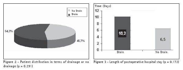 The evolution was generally favorable. By postoperative day 30, no deaths had occurred. In studying the length of the hospital stay in these patients, we observed that the average postoperative hospital stay for patients not submitted to drainage was 6.5 days, shorter than the 10.2 days observed for patients submitted to drainage. However, this difference was not significant. Apparently, patients who had not been submitted to drainage experienced less postoperative pain and ambulated sooner.