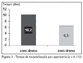 A evolução foi boa em geral, sem nenhum óbito até o 30º dia pós-operatório. Ao se estudar o tempo de internação desses pacientes, observou-se que o tempo médio de internação pós-operatória nos pacientes não drenados foi de 6,5 dias, menor que aquele observado nos pacientes drenados, que foi de 10,2 dias, mas esta diferença não foi significativa. Aparentemente os pacientes não drenados apresentaram evolução pós-operatória menos dolorosa e deambulação mais precoce.