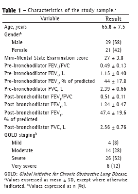 During the evaluation of the reproducibility of the BPQ, 29 men and 21 women were evaluated, the mean age being 65.6 years. Most of the patients were classified as having moderate or severe COPD. Spirometry showed that there was no positive bronchodilator response. Cognitive assessment with the Mini-Mental State Examination showed that the patients had good cognitive function. The characteristics of the participants, including data on pulmonary function, disease severity, socioeconomic status, and the Mini-Mental State Examination score, are shown in Table 1.
